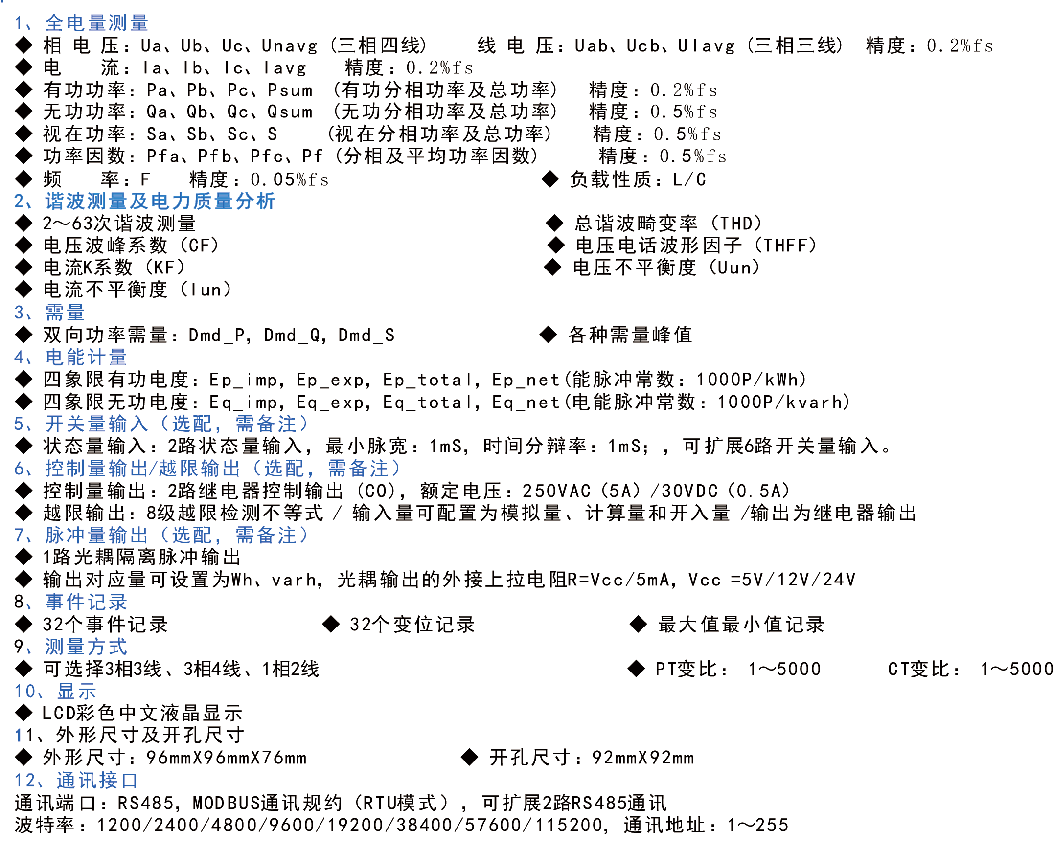 MT361Z-9MY電力質(zhì)量分析儀采用高速高性能的芯片作為處理器設(shè)計(jì)而成。集合全面的三相電量測量、顯示、四象限有功電度、四象限無功電度、電力質(zhì)量分析、故障報(bào)警、數(shù)字量輸入、輸出與網(wǎng)絡(luò)通訊于一身。采用大屏幕、高清晰彩色中文液晶顯示,充分滿足您的視覺要求,優(yōu)雅、明亮的背光顯示使您在微弱光線下亦能輕松查閱測量數(shù)據(jù)。全中文、人性化的操作方法使得用戶可以在短時間內(nèi)掌握。