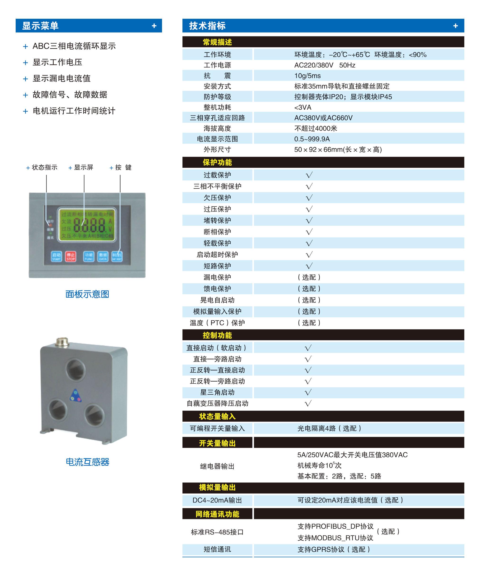 為電機提供的完備保護,避免了因電機熱過載、堵轉(zhuǎn),欠壓、輕載,斷相、三相不平衡、電機過熱(PT)、接地等可能故障導(dǎo)致生產(chǎn)事故、最大限度地保證設(shè)備運行有效性與安全。
